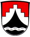 | + | DE: ''In Rot ein erhöhter silberner Stufengiebel, belegt mit einer eingeschweiften schwarzen Spitze, darin unten ein silberner Wellenbalken.'' | ||