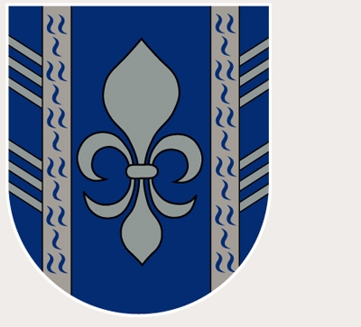 DE: Eine silberne Lilie im blauen Schild mit gespaltenen Flanken, die innen geflutet sind und außen erhöht und erniedrigt je drei einwärts gerichtete silberne Kerben haben.