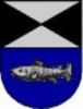 DE: Im geteilten Schild das obere Feld von Silber und Schwarz schräggeviert, das untere blaue Feld mit einem silbernen Fisch belegt.