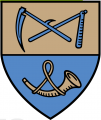 DE: Im von Gold zu Blau geteilten Schild oben schläggekreuzt eine blaue Sense und ein blauer Dreschflegel, unten ein goldenes Jagdhorn.