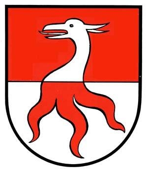 DE: Schild geteilt. Oben auf Rot silberner Reiherkopf nach rechts, unten auf Silber in drei roten Flammen auslaufend.
