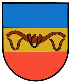 DE: Schild dreigeteilt von Blau, Gold, Rot. Im goldenen Feld ein natürliches Ochsenzugjoch in brauner Farbe.