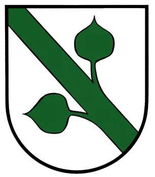 DE: In Silber ein schrägrechts durchgehender grüner Zweig, an dem beiderseits ein Laub sprießt.