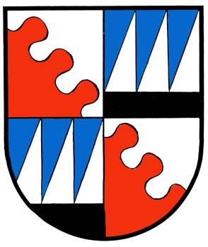 DE: Schild geviert, Felder 1 und 4 von Silber und Rot im Wolkenschnitt schrägrechts geteilt, Felder 2 und 3 über schwarzem Fuß von Blau und Silber im Zahnschnitt geteilt.