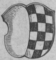 DE: Gespalten: vorne Blau, hinten geschacht von Rot und Silber.