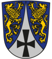 DE: In Blau zwischen zwei zugewandten goldenen Löwen eine eingeschweifte silberne Spitze, darin ein schwarzes Tatzenkreuz.