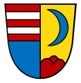 DE: Gespalten und vorne geteilt; oben fünfmal geteilt von Rot und Silber, unten blau; hinten über rotem Dreiberg in Gold ein blauer Halbmond.