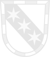 DE: ''In Silber mit von Rot und Silber gestücktem Bord ein mit drei sechsstrahligen goldenen Sternen belegter schwarzer Schrägbalken.'' | DE: ''In Silber mit von Rot und Silber gestücktem Bord ein mit drei sechsstrahligen goldenen Sternen belegter schwarzer Schrägbalken.'' | ||