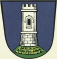 DE: In Blau auf grünem Hügel ein runder, torloser silberner Zinnenturm.