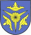 DE: In Blau ein zwölfstrahliger facettierter goldener Stern mit drei verlängerten Strahlen, umgeben von drei (1:2) auswärts gewandten goldenen Laubkronen.