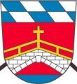 DE: Unter Schildhaupt mit den bayerischen Rauten in Rot über blauem Wasser eine gemauerte, einbogige silberne Brücke mit goldenem Geländer und Brückenkreuz.