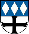 DE: ''Geteilt von Blau und Silber; oben nebeneinander drei durchgehende, senkrecht stehende silberne Rauten, unten ein durchgehendes schwarzes Tatzenkreuz.'' | DE: ''Geteilt von Blau und Silber; oben nebeneinander drei durchgehende, senkrecht stehende silberne Rauten, unten ein durchgehendes schwarzes Tatzenkreuz.'' | ||