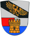 DE: Geteilt; oben in Silber ein schwarzer Schrägbalken, der mit einem goldenen Adler belegt ist; unten wieder geteilt, oben gespalten von Rot und Silber, unten Blau, belegt mit einem goldenen Zinnenturm.