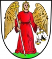DE: In Silber auf grünem Boden stehend der Erzengel Michael im langen, roten Gewand mit goldenen Flügeln; er hält in der Rechten einen silbernen Stab mit goldenem Kreuz, mit der Linken eine goldene Waage, in deren gesenkter Schale ein nackter Mensch, in der erhöhten ein Teufel sitzt.