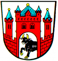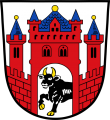 DE: In Silber eine rote Burg mit breitem Mittelturm und zwei spitzbedachten seitlichen Zinnentürmen, alle mit blauen Dächern; aus dem Tor hervorbrechend ein golden bewehrter schwarzer Ochse.