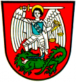 DE: In Rot der auf einem linkshingewendeten grünen Drachen stehende Erzengel Michael in silberner Rüstung und wallendem silbernen Mantel; auf der Brust einen blauen Schild mit silbernem Schrägbalken tragend, der mit drei blauen Ringen belegt ist, in der Rechten ein silbernes Schwert über das Haupt haltend, in der Linken eine goldene Waage, deren rechte Schale niedersinkt.