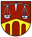 DE: In Rot oben eine silberne Balkenwaage, unten eine dreibogige goldene Brücke.