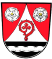 DE: Über einem schwarzen Schildfuß, darin ein silberner Wellenbalken, in Rot eine durchgehende eingeschweifte silberne Spitze, darin die rote Krümme eines Abtstabes, beseitet von je einer silbernen heraldischen Rose mit goldenen Butzen.