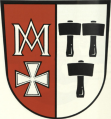DE: Gespalten von Rot und Silber, vorne über einem silbernen Ulrichskreuz ein silbernes Marienmonogramm, hinten drei zwei zu eins gestellte schwarze Schlägel.