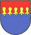 DE: Aus rotem Wolkenschildhaupt fallen über Blau fünf sich berührende goldene Zungenblitze.