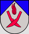 DE: In Blau eine silberne, erhöhte Spitze, darin über zwei roten, gestüzten und gekreuzten Pflugscharen eine rote Flamme.