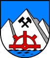 DE: Im blauen Schild ein silberner Dreifels, belegt mit gekreuzten schwarzem Eisen und Schlägel und davor aus naturfärbigem Wellenschildfuß ragend ein rotes Mühlrad.