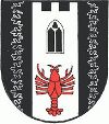 DE: In Schwarz pfahlweise ein dreizinniger silberner Turm mit durchbrochenem gotischen zweibahnigen Maßwerkfenster, darunter belegt mit einem roten Krebs; die Flanken durch silberne Tannenreisigschnitte gespalten.