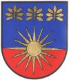 DE: Ein Schild von Blau und Rot im Schildfuß durch eine goldene Strahlensonne geteilt, diese von drei goldenen Nußblättern überhöht.