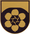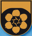 DE: Im goldenen Schild ein erhöhter, in das Schildhaupt wachsender schwarzer Berg mit abgeplattetem Gipfel, kranzförmig belegt mit sechs sich berührenden goldenen Äpfeln, deren Kelche auswärts gekehrt sind und deren Stiele rechts gekrümmt, sich berühren.
