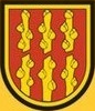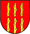 DE: Im schwarz und golden gerandeten roten Schild pfahlweise drei in der Mitte schräglinks zerbrochene goldene Reiser.