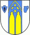 DE: Im silbernen Schild ein blauer Pfahl, ein wachsendes gotisches Maßwerkfenster darstellend, dessen Öffnungen golden durchbrochen sind, begleitet vorn von einer blauen mit einer schwarzen Tanne belegten Pflugschar, hinten von einem blauen Wasserkrug.