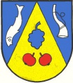DE: Im blauen Schild eine mit zwei roten Äpfeln und einer blauen Traube belegte goldene Spitze, vorne von einem silbernen, abwärts gekehrten Fisch, hinten von einem silbernen Jagdhorn begleitet.
