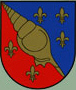 DE: In einem von Blau und Rot durch ein goldenes fossiles Schneckengehäuse mit nach links unten zeigendem Schnabel schrägrechts geteilten Schild links oben drei, rechts unten zwei goldene Lilien.