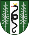 DE: In einem grünen Schild ein silberner, mit einer schwarzen, goldgekrönten, rotbezungten Schlange belegter Pfahl, der beiderseits von einem silbernen, aus dem Schildrand wachsenden Fichtenbaum begleitet wird.