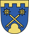 DE: Unter unten gezinntem, goldenem Schildhaupt in Blau über goldenem Dreiberg zwei schräg gekreuzte goldene Morgensterne mit silbernen Handschlaufen.