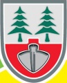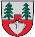 DE: Mit einer Zinne geteilt von Silber und Rot; oben zwei grüne Tannen, unten eine silberne Pflugschar.