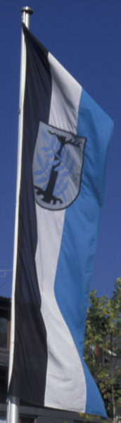 Knatterflagge (schwarz-weiß-blau mit Wappen), Wappenschild grau! Rathaus, 03.10.2001