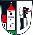 DE: Gespalten von Schwarz und Silber; vorne auf grünem Boden eine silberne Kirche mit romanischem Turm und roten Dächern, hinten ein linksgewendeter, von Silber und Schwarz gevierter, rot bezungter Brackenrumpf.