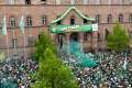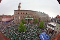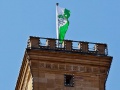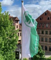 Tour am 02.07.2021 (Tag der Franken): vor dem Rathaus drei Knatterflaggen, auf dem Rathausturm eine Hissflagge (alles SpVgg Greuther Fürth)