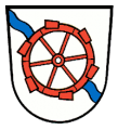 DE: In Silber ein blauer Schrägwellenbalken, der durch ein rotes Wasserschöpfrad in altertümlicher Form unterbrochen ist.
