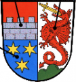 DE: Gespalten und vorne geteilt; oben in Rot eine silberne Zinnenmauer, unten in Blau drei zwei zu eins gestellte sechsstrahlige Sterne, hinten über grünem Dreiberg in Silber ein roter Drache mit goldenem Schwert im aufgerissenen Maul.