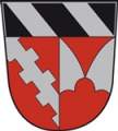 DE: Unter schwarzem Schildhaupt mit zwei silbernen Schrägbalken gespalten von Rot und Silber, vorne ein schräger silberner Gegenzinnenbalken, hinten auf rotem Dreiberg stehend eine gestürzte eingeschweifte rote Spitze.