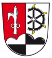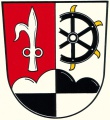 DE: Über einem von Silber und Schwarz gevierten Dreiberg gespalten von Rot und Silber; vorne ein silberner Feuerhaken, hinten ein mit Messern besetztes halbes schwarzes Rad.