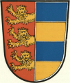 DE: Gespalten, vorn am Spalt in Rot drei goldene Leoparden, hinten dreimal geteilt von Blau und Gold.