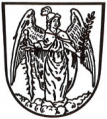 DE: In Silber auf silbernen Wolken stehend der Erzengel Michael mit goldenen Flügeln, rotem Mantel und blauem Untergewand, einem goldenen Helm mit rotem Federbusch auf dem Haupt, in der Rechten einen grünen Olivenzweig.