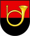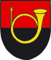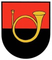 DE: Schild geteilt von Rot und Schwarz, darin ein goldenes Posthorn ohne Verschnürung.