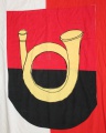 Besuch 17.10.2018: nach längerem Hin und Her findet sich die Fahne (Banner, weiß-rot, mit sehr handgemachtem Wappen)
