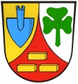 DE: Durch eine eingeschweifte rote Spitze, darin drei 1 zu 2 gestellte goldene Ziegelsteine, gespalten von Gold und Silber; vorne ein blaues Spatenblatt, hinten ein grünes Kleeblatt.
