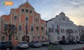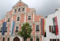 Banner (grün-rot, ohne Wappen) vor dem Rathaus; von Panoramio