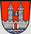 DE: In Rot über blauen und silbernen Wellen eine silberne Burg mit offenem Tor und zwei spitzbedachten Zinnentürmen; zwischen ihnen schwebend ein gelehntes Schildchen mit den bayerischen Rauten.